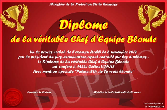 Envoyez par email votre Diplôme de la véritable Chef d'Equipe Blonde personalisé