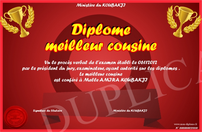 Envoyez par email votre Diplôme meilleur cousine personalisé