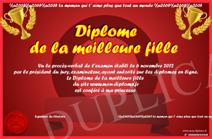 Envoyez par email votre Diplome de la meilleure fille personalisé