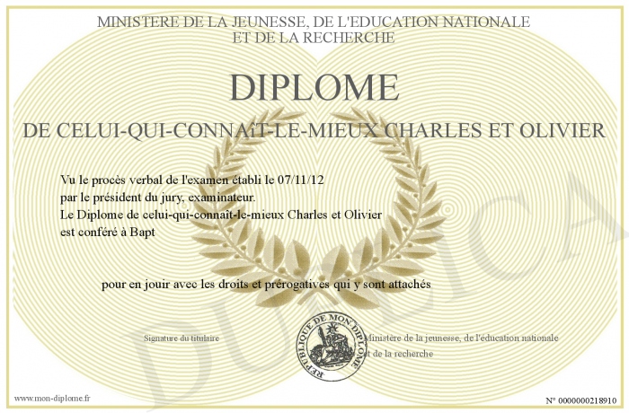 Envoyez par email votre Diplôme de celui-qui-connaît-le-mieux Charles et Olivier personalisé