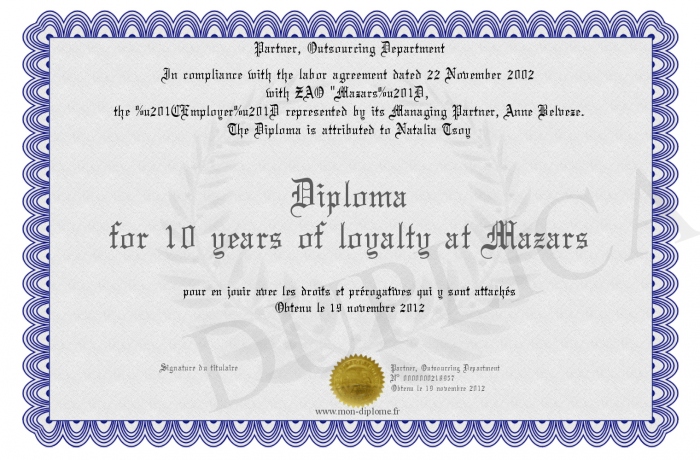 Envoyez par email votre Diploma for 10 years of loyalty at Mazars personalisé