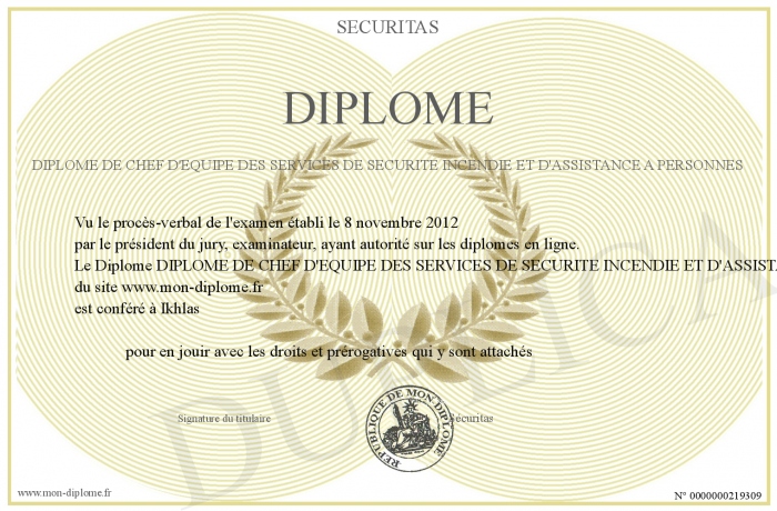 Envoyez par email votre Diplôme DIPLOME DE CHEF D'EQUIPE DES SERVICES DE SECURITE INCENDIE ET D'ASSISTANCE A PERSONNES personalisé