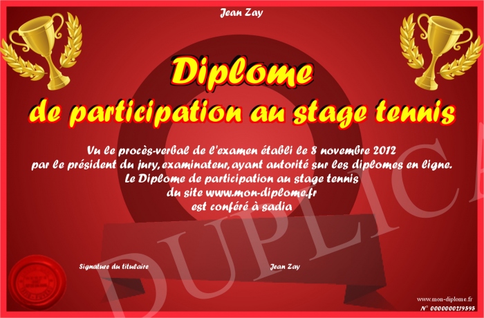 Envoyez par email votre Diplôme de participation au stage tennis personalisé