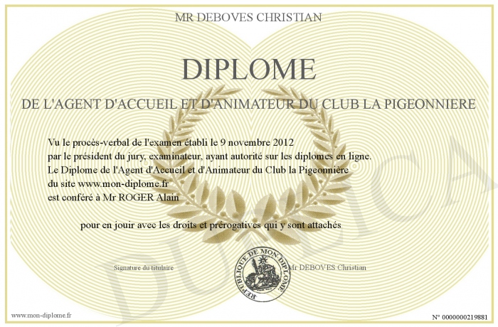 Envoyez par email votre Diplome de l'Agent d'Accueil et d'Animateur du Club la Pigeonnière personalisé