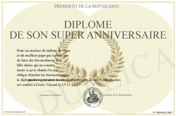 Envoyez par email votre Diplôme de son super anniversaire personalisé
