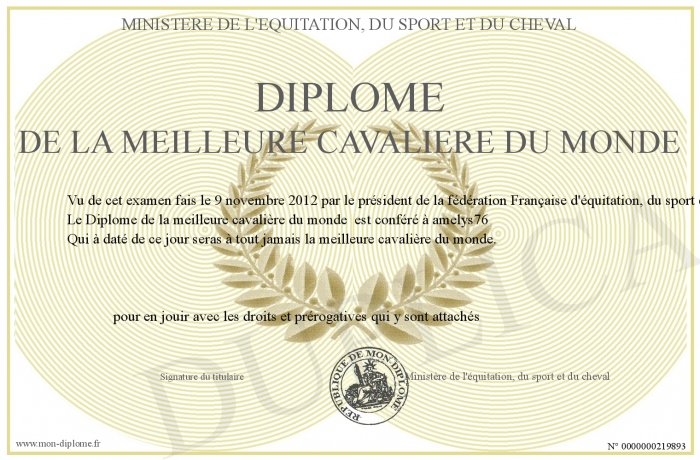 Envoyez par email votre Diplôme de la meilleure cavalière du monde personalisé