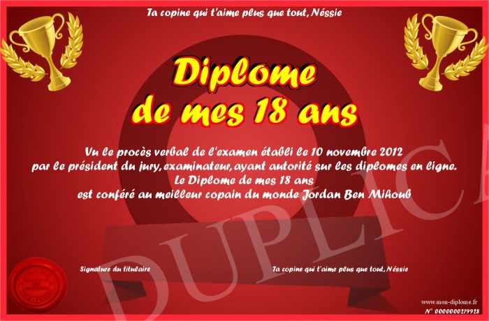 Envoyez par email votre Diplôme de mes 18 ans personalisé