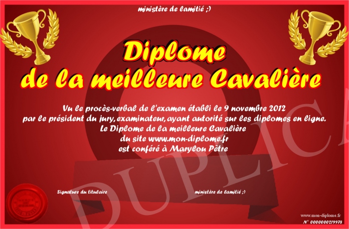 Envoyez par email votre Diplome de la meilleure Cavalière personalisé