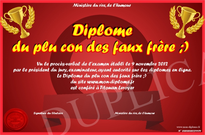 Envoyez par email votre Diplome du plu con des faux frère ;) personalisé