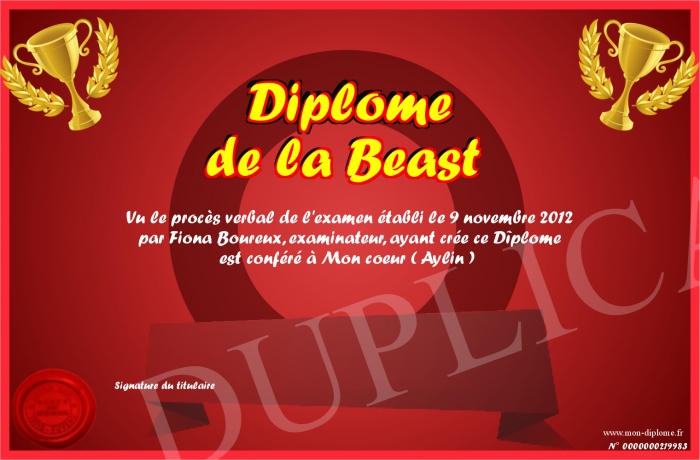 Envoyez par email votre Diplome de la Beast personalisé