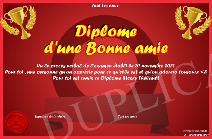 Envoyez par email votre Diplome d'une Bonne amie personalisé
