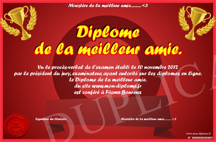 Envoyez par email votre Diplome de la meilleur amie. personalisé