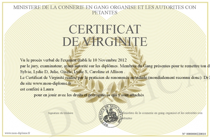 Envoyez par email votre CERTIFICAT de VIRGINITE personalisé