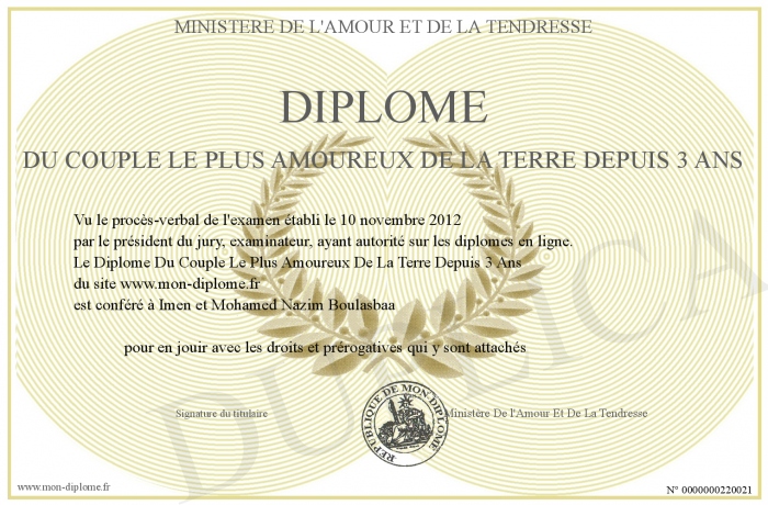 Envoyez par email votre Diplôme Du Couple Le Plus Amoureux De La Terre Depuis 3 Ans personalisé