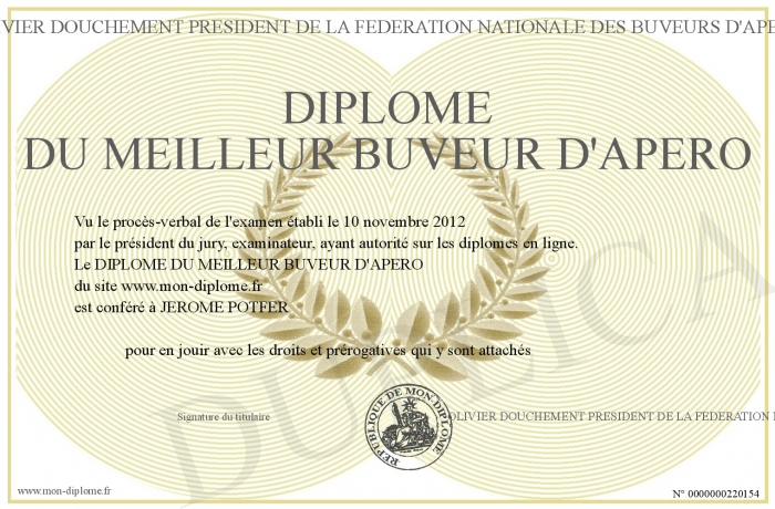 Envoyez par email votre DIPLOME DU MEILLEUR BUVEUR D'APERO personalisé