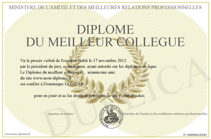 Envoyez par email votre Diplôme du meilleur collègue personalisé