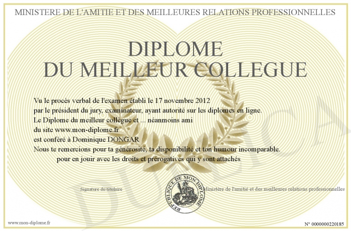 Envoyez par email votre Diplôme du meilleur collègue personalisé