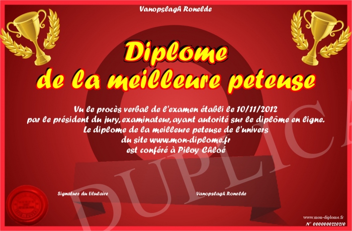 Envoyez par email votre Diplôme de la meilleure peteuse personalisé