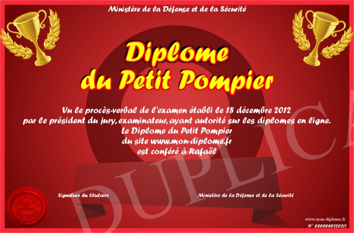 Envoyez par email votre Diplôme du Petit Pompier personalisé