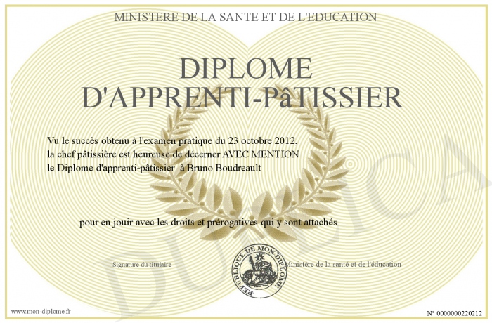 Envoyez par email votre Diplôme d'apprenti-pâtissier personalisé