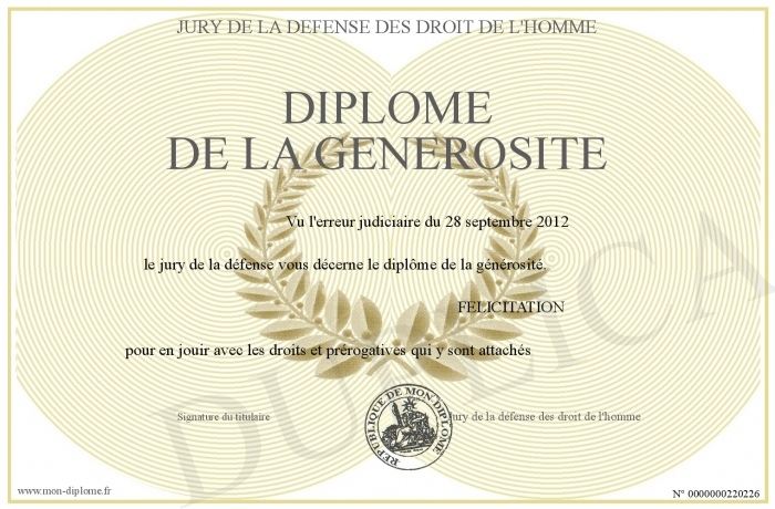 Envoyez par email votre DIPLOME DE LA GENEROSITE personalisé