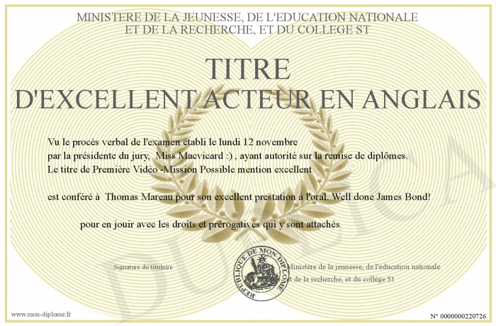 Envoyez par email votre titre d'excellent acteur en anglais personalisé