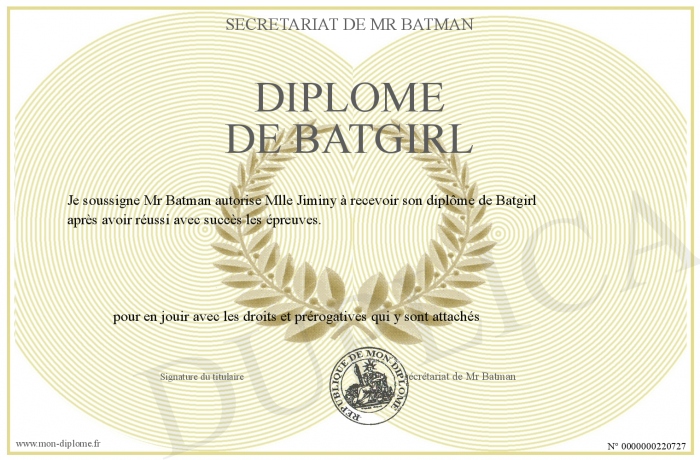 Envoyez par email votre Diplôme de BatGirl personalisé