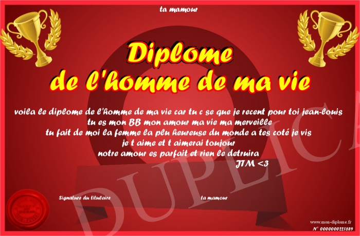 Envoyez par email votre Diplôme de l'homme de ma vie personalisé