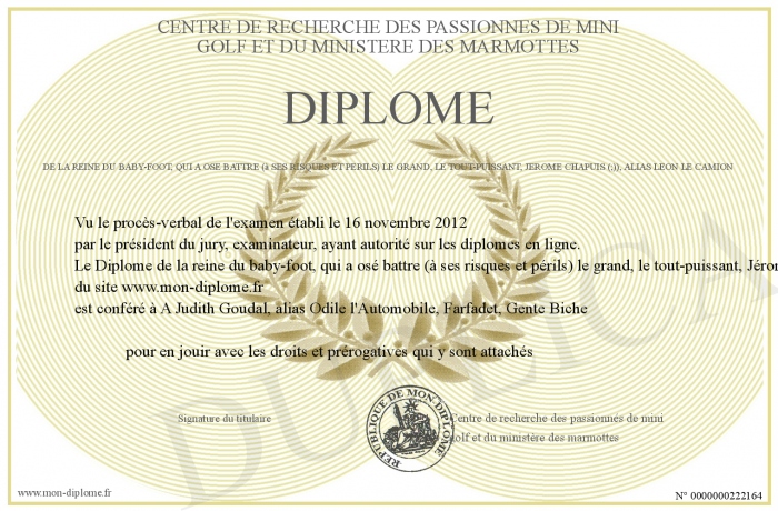 Envoyez par email votre Diplôme de la reine du baby-foot, qui a osé battre (à ses risques et périls) le grand, le tout-puissant, Jérôme Chapuis (;)), alias Léon le camion personalisé