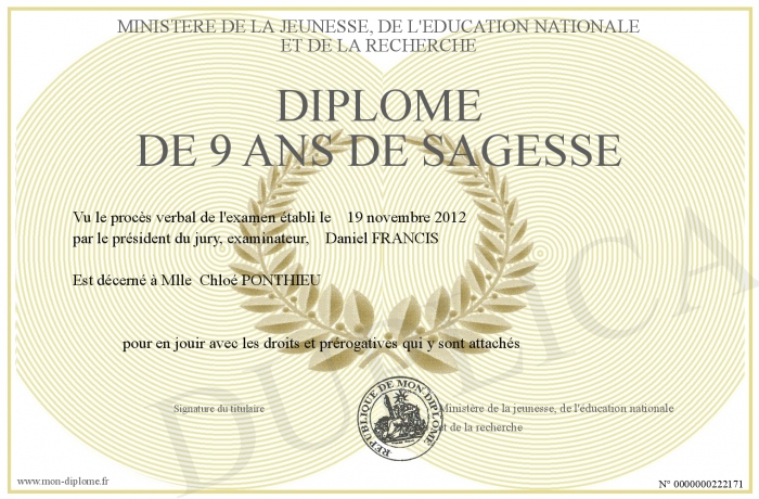 Envoyez par email votre Diplôme de 9 ans de sagesse personalisé