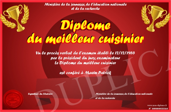Envoyez par email votre Diplôme du meilleur cuisinier personalisé