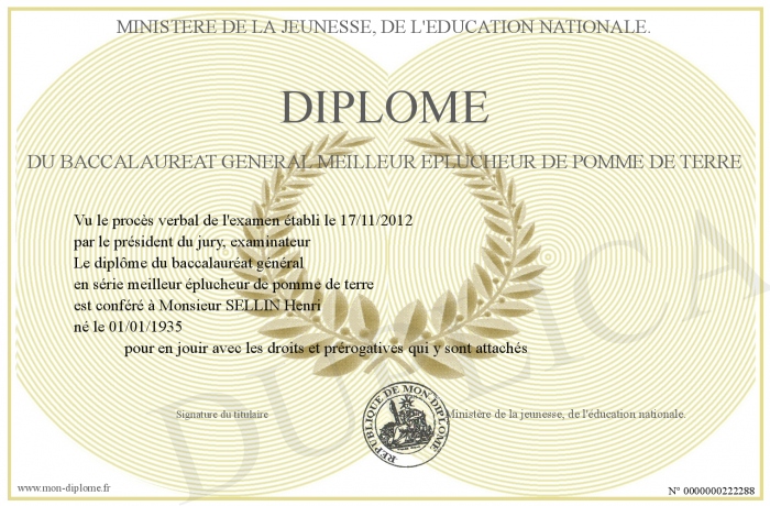 Envoyez par email votre Diplôme du Baccalauréat Général meilleur éplucheur de pomme de terre personalisé