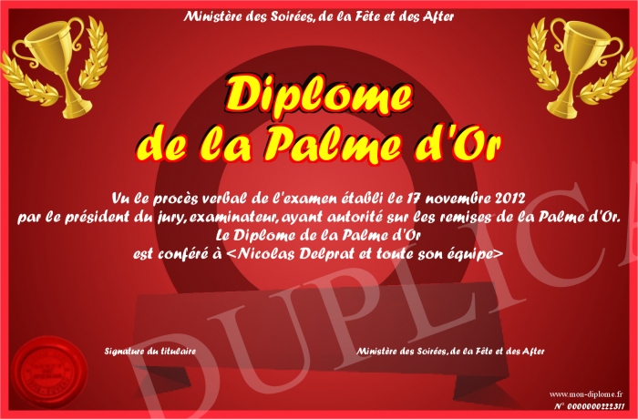 Envoyez par email votre Diplôme de la Palme d'Or personalisé