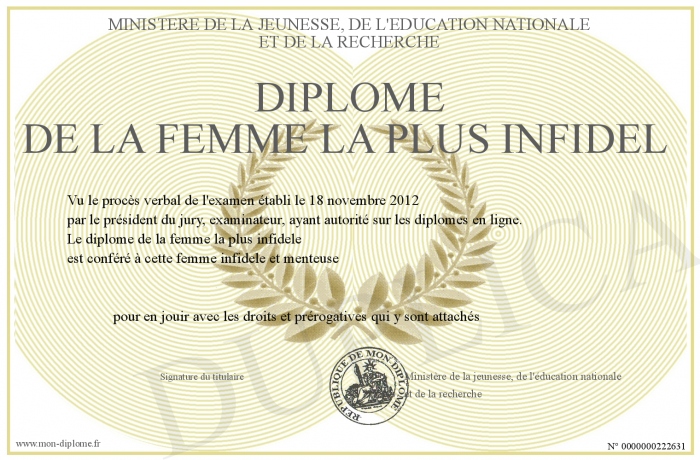 Envoyez par email votre Diplôme de la femme la plus infidel personalisé