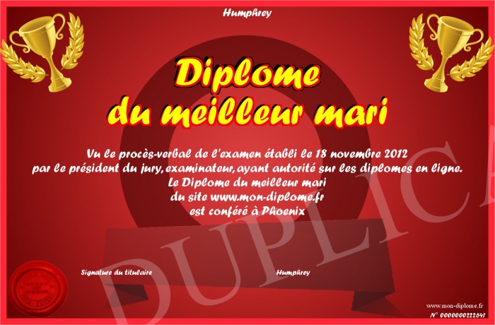 Envoyez par email votre Diplome du meilleur mari personalisé
