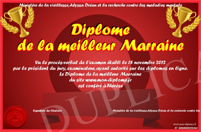 Envoyez par email votre Diplôme de la meilleur Marraine personalisé
