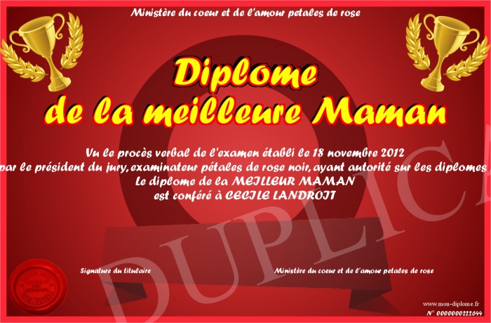 Envoyez par email votre Diplome de la meilleure Maman personalisé