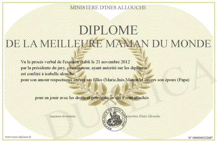 Envoyez par email votre Diplôme de la meilleure maman du monde personalisé