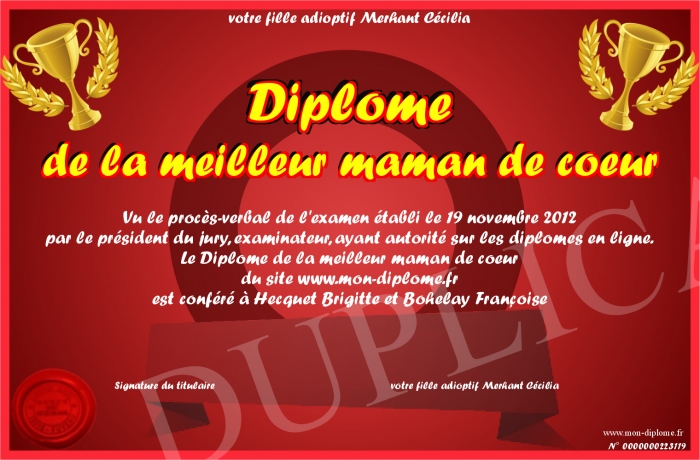 Envoyez par email votre Diplôme de la meilleur maman de coeur personalisé