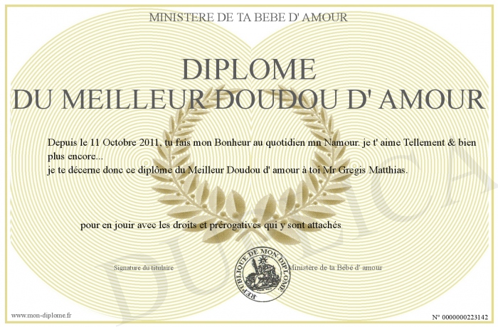 Envoyez par email votre Diplôme du Meilleur Doudou d' amour personalisé
