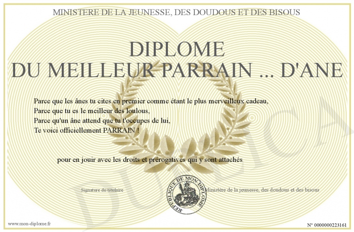 Envoyez par email votre Diplôme du meilleur parrain ... d'ane personalisé