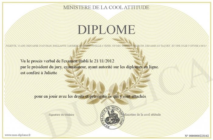 Envoyez par email votre Diplôme Juliette, 25 ans, rescapée d'auchan, brillante carrière professionnelle à venir, un mec bientot medecin, des amis au taquet...et une jolie voiture à moi ! personalisé