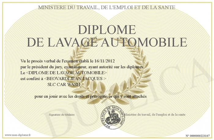 Envoyez par email votre Diplome de lavage automobile personalisé