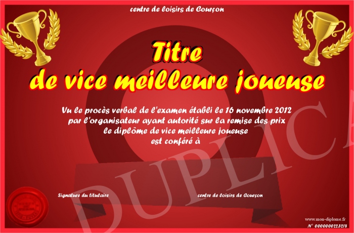 Envoyez par email votre Titre de vice meilleure joueuse personalisé
