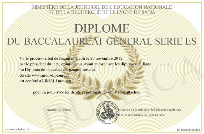 Envoyez par email votre Diplôme du baccalaureat général serie es personalisé