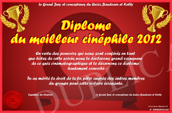 Envoyez par email votre Diplôme du meilleur cinéphile 2012 personalisé