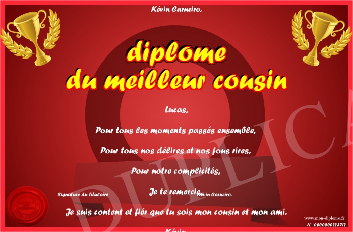 Envoyez par email votre diplôme du meilleur cousin personalisé