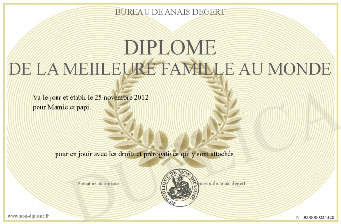 Envoyez par email votre Diplôme de la meiileure famille au monde personalisé