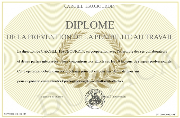 Envoyez par email votre Diplôme de la prevention de la penibilite au travail personalisé