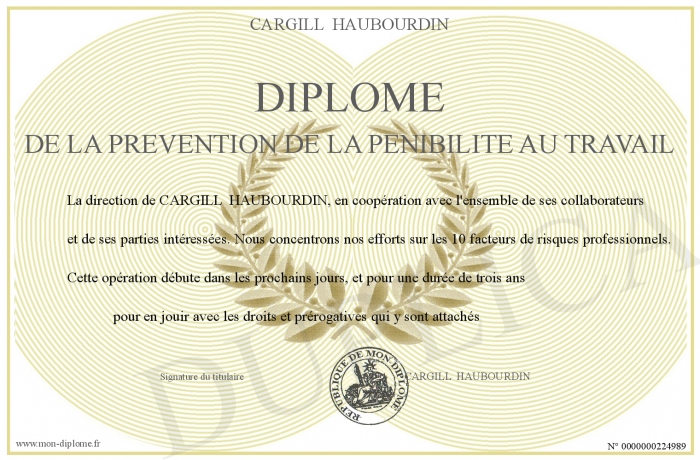 Envoyez par email votre Diplôme de la prevention de la penibilite au travail personalisé
